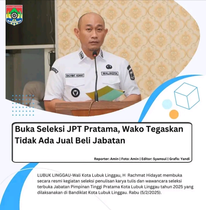 LUBUK LINGGAU-Inspirator-rakyat.com.-Wali Kota Lubuk Linggau, H Rachmat Hidayat membuka secara resmi kegiatan seleksi penulisan karya tulis dan wawancara seleksi terbuka Jabatan Pimpinan Tinggi Pratama Kota Lubuk Linggau tahun 2025 yang dilaksanakan di Bandiklat Kota Lubuk Linggau. Rabu (5/2/2025).