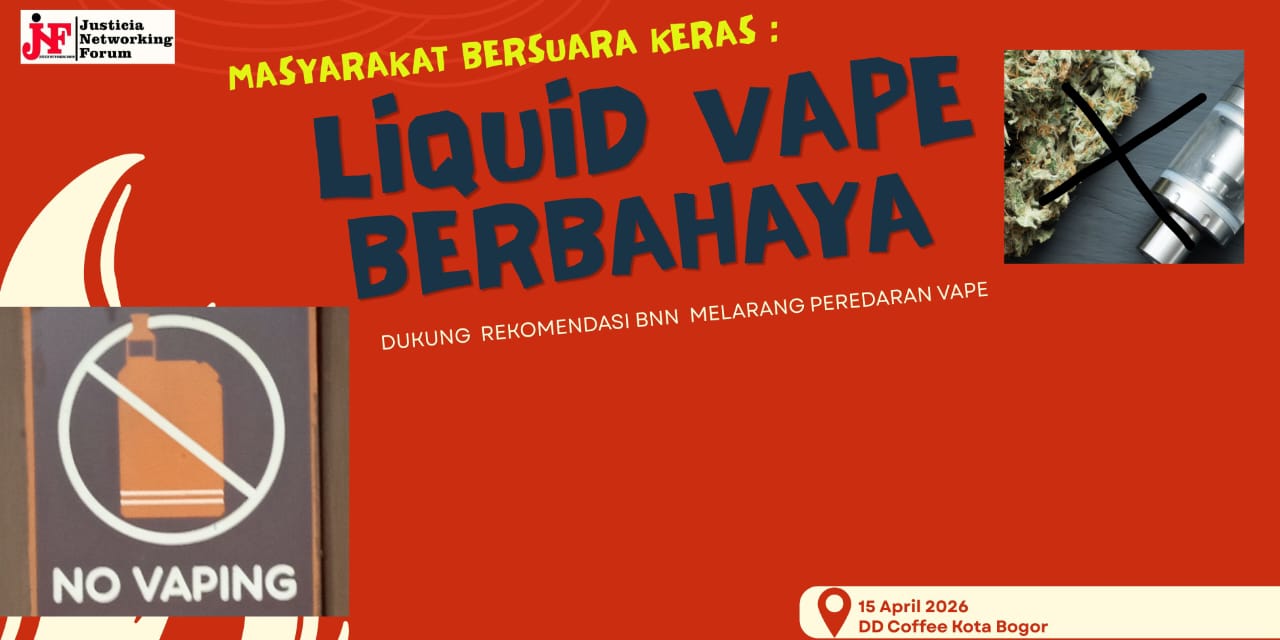 Justicia Networking Forum (JNF ) bersama Sejumlah elemen Jaringan Aktivis Pergerakan akan Menggelar Masyarakat Bersuara Keras : Liquid Vape Berbahaya , Dukung Rekomendasi BNN Melarang Peredaran Vape .Hari /tgl : Rabu , 15 April 2026 bertempat di salah satu Coffee shop di Kota Bogor