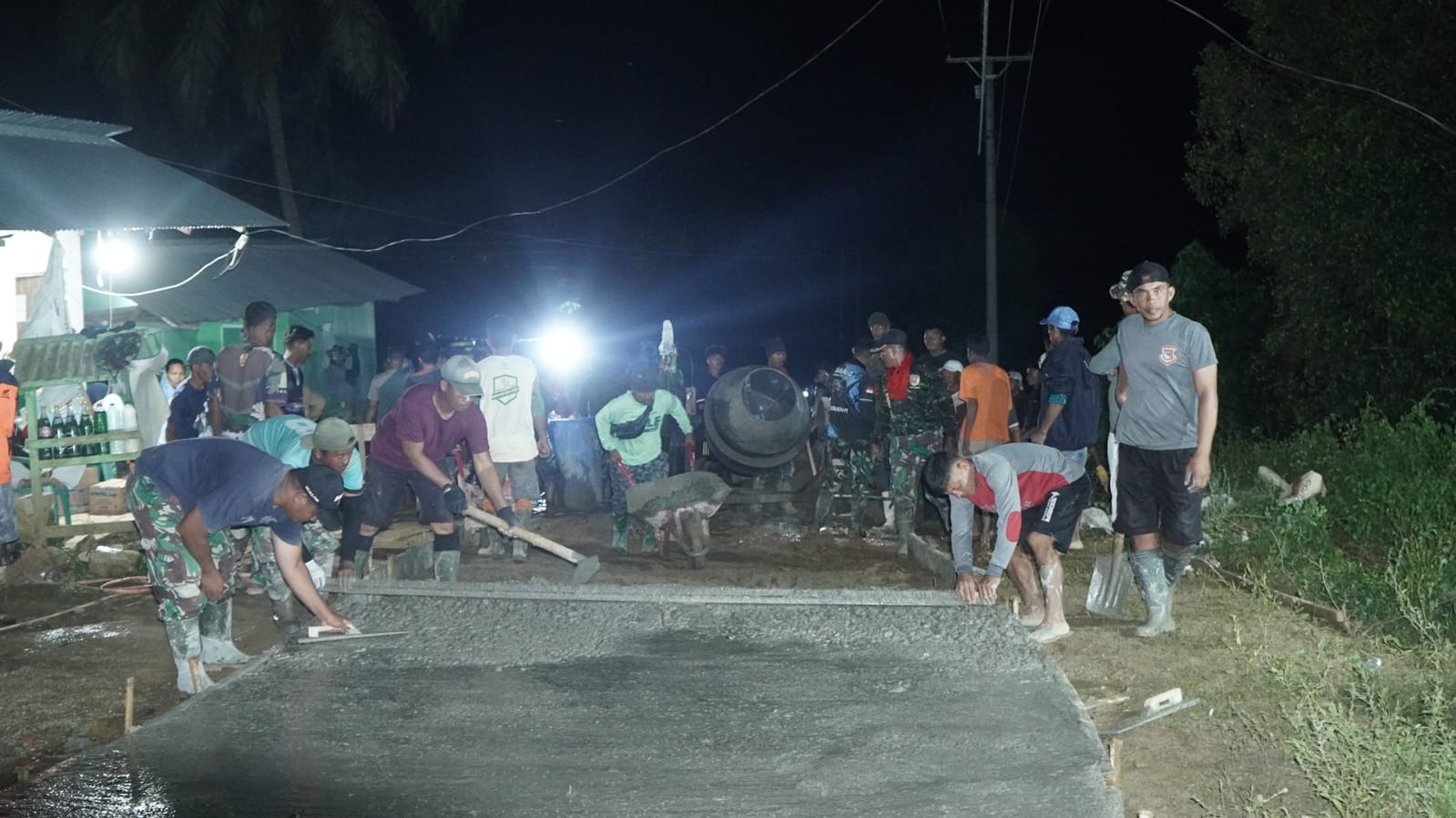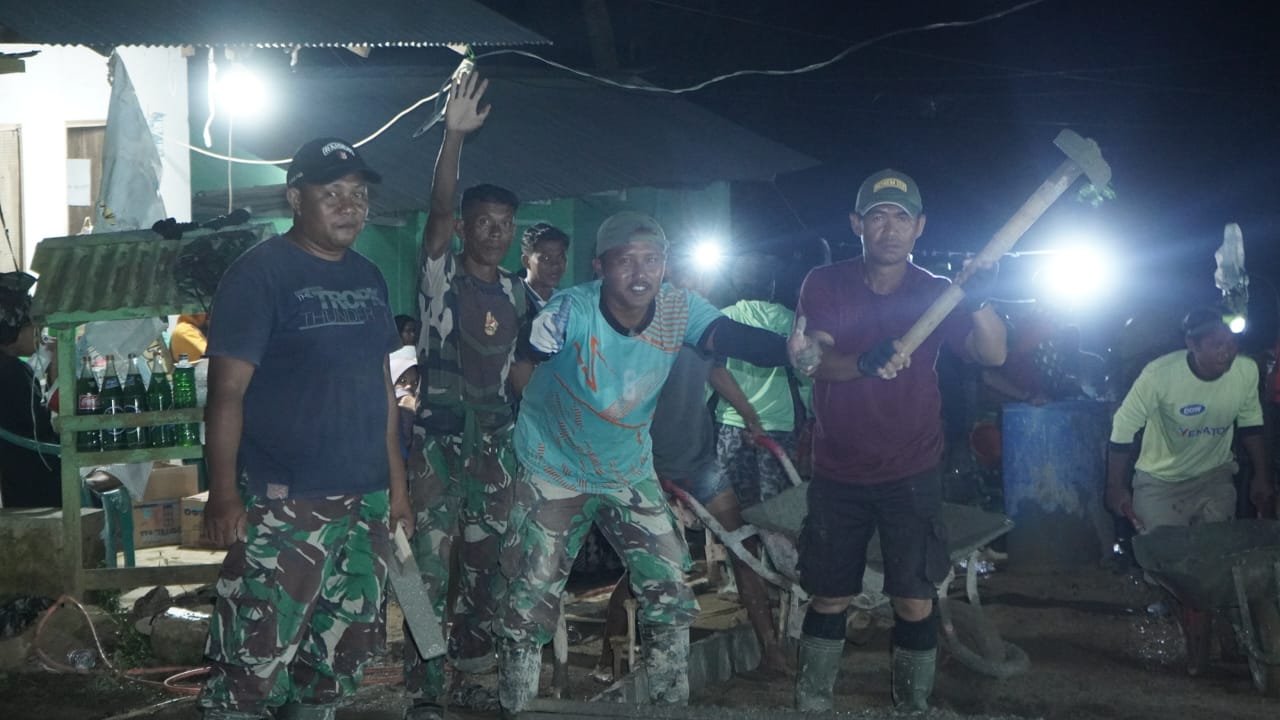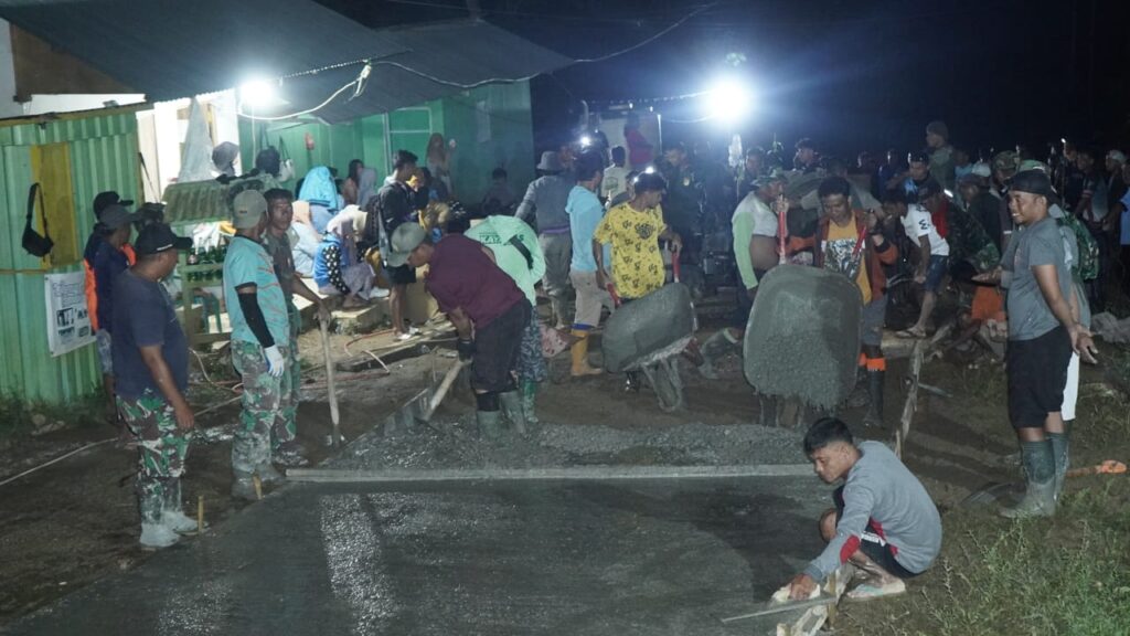 Dinginnya malam tidak menyurutkan semangat Satgas TMMD dan warga Tonala. Mereka berbagi tugas dengan penuh keakraban, dari mengaduk material, menuang beton, hingga meratakan permukaan jalan. Kelelahan berganti tawa dan canda, menepis batas antara anggota TNI dan warga sipil.