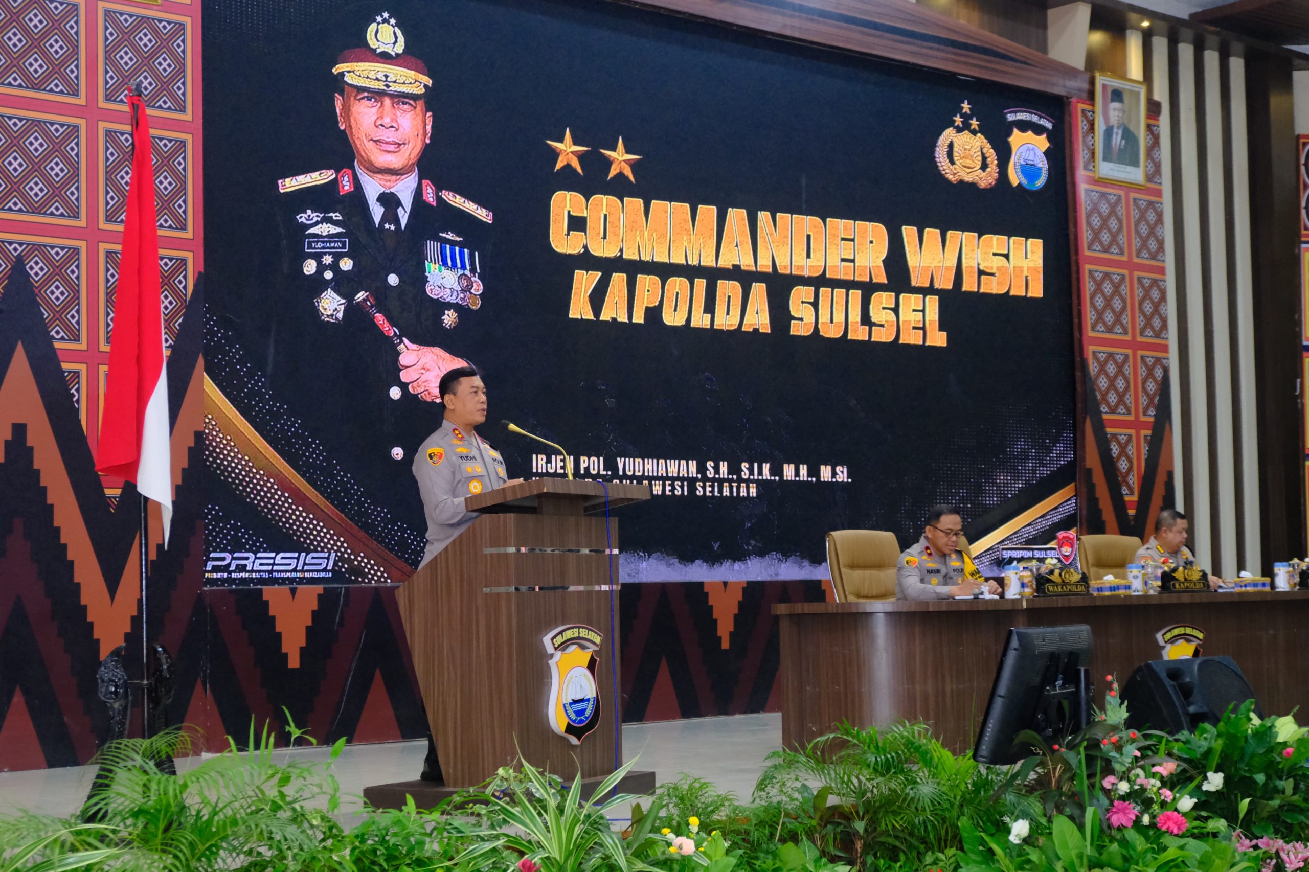 (Inspirator)-Kapolda Sulawesi Selatan Irjen Pol. Yudhiawan S.H., S.I.K., M.H., M.Si. didampingi Wakapolda Sulsel Brigjen Pol Nasri, S.I.K., M.H. dan Irwasda Kombes Pol Ai Afriandi S.H., S.I.K., M.M., serta Pejabat Utama Polda Sulsel Melaksanakan Commander Wish di Aula Mappaodang Polda Sulsel, Kamis (03/10/24).