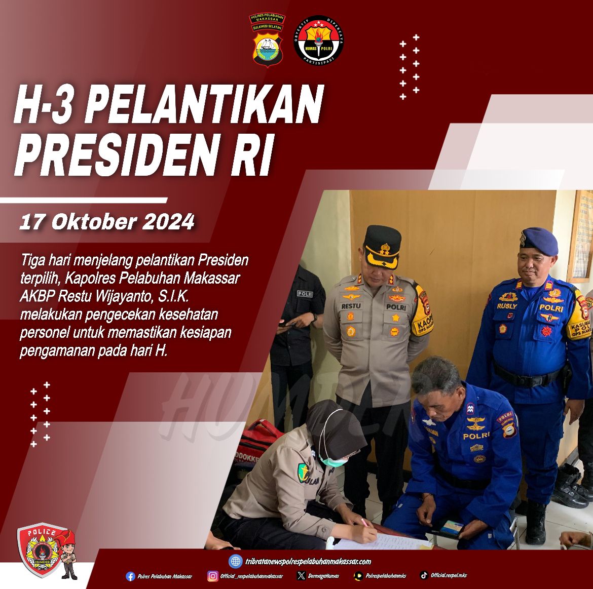 Makassar, Inspirator-rakyat– HUMDER-Tiga hari menjelang pelantikan Presiden terpilih, Kapolres Pelabuhan Makassar AKBP Restu Wijayanto melakukan pengecekan kesehatan personel untuk memastikan kesiapan pengamanan pada hari H. Langkah ini diambil untuk memastikan seluruh anggota Polres dalam kondisi prima dan siap menjalankan tugas pengamanan dengan maksimal.