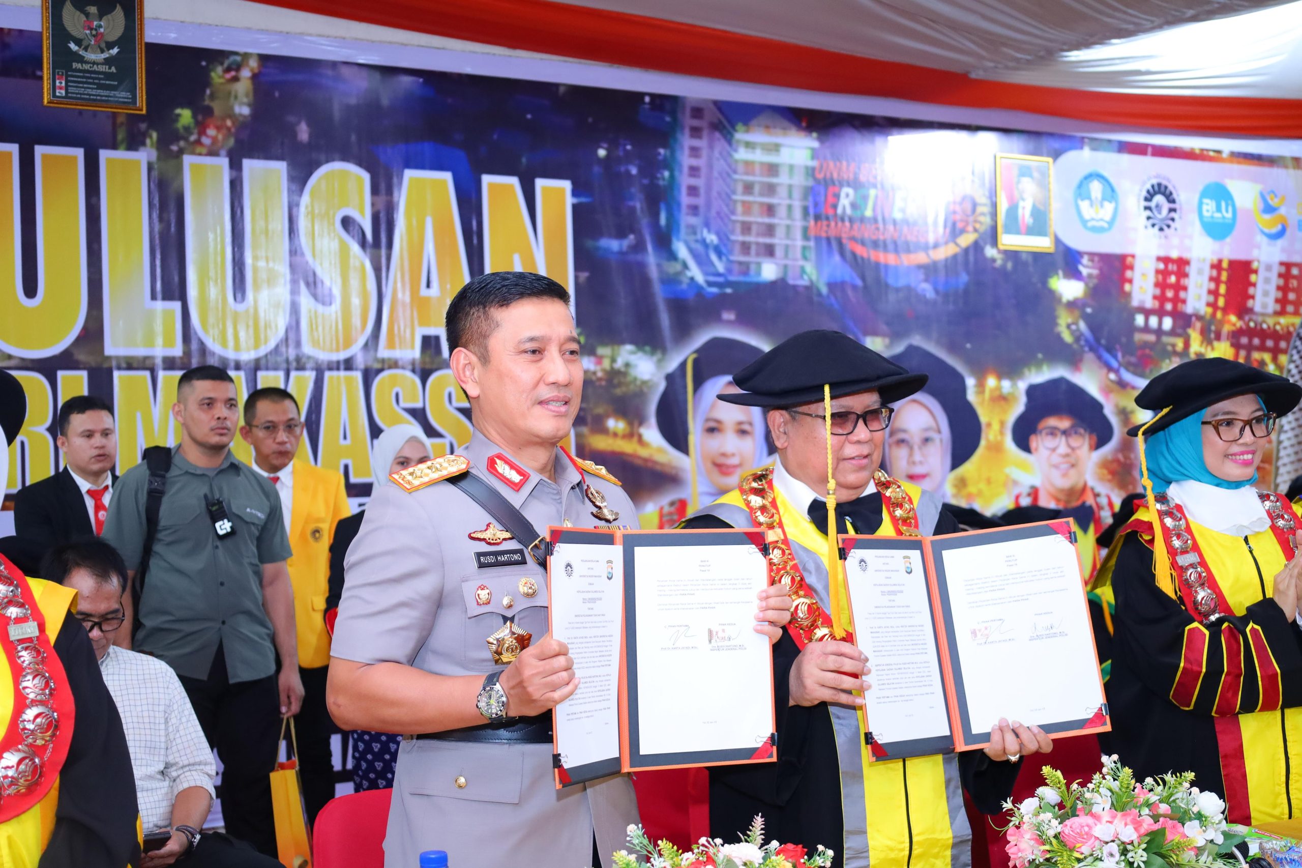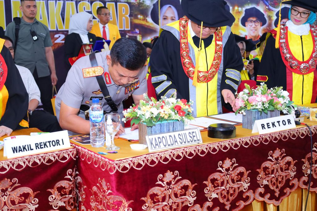 (Inspirator)-Makassar – Kapolda Sulawesi Selatan, Irjen Pol. Drs. Rusdi Hartono, M.Si., menghadiri kegiatan Penandatanganan Nota Kesepahaman (MoU) antara Kepolisian Daerah Sulawesi Selatan (Polda Sulsel) dengan Universitas Negeri Makassar (UNM), Kamis (31/07/2025). Acara berlangsung di Pelataran Gedung Menara Pinisi UNM dan turut dihadiri oleh Pejabat Utama Polda Sulsel serta jajaran pimpinan UNM.