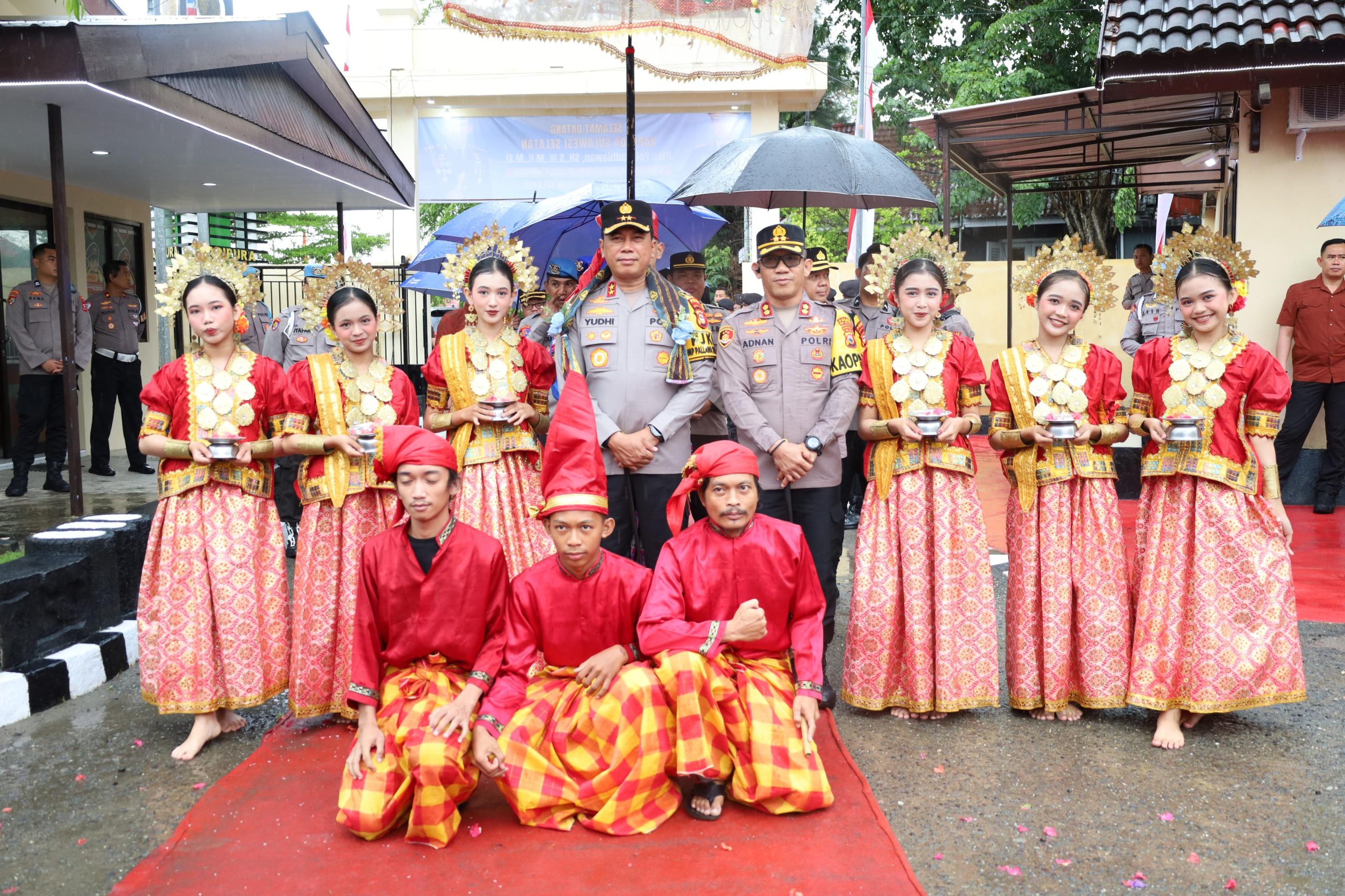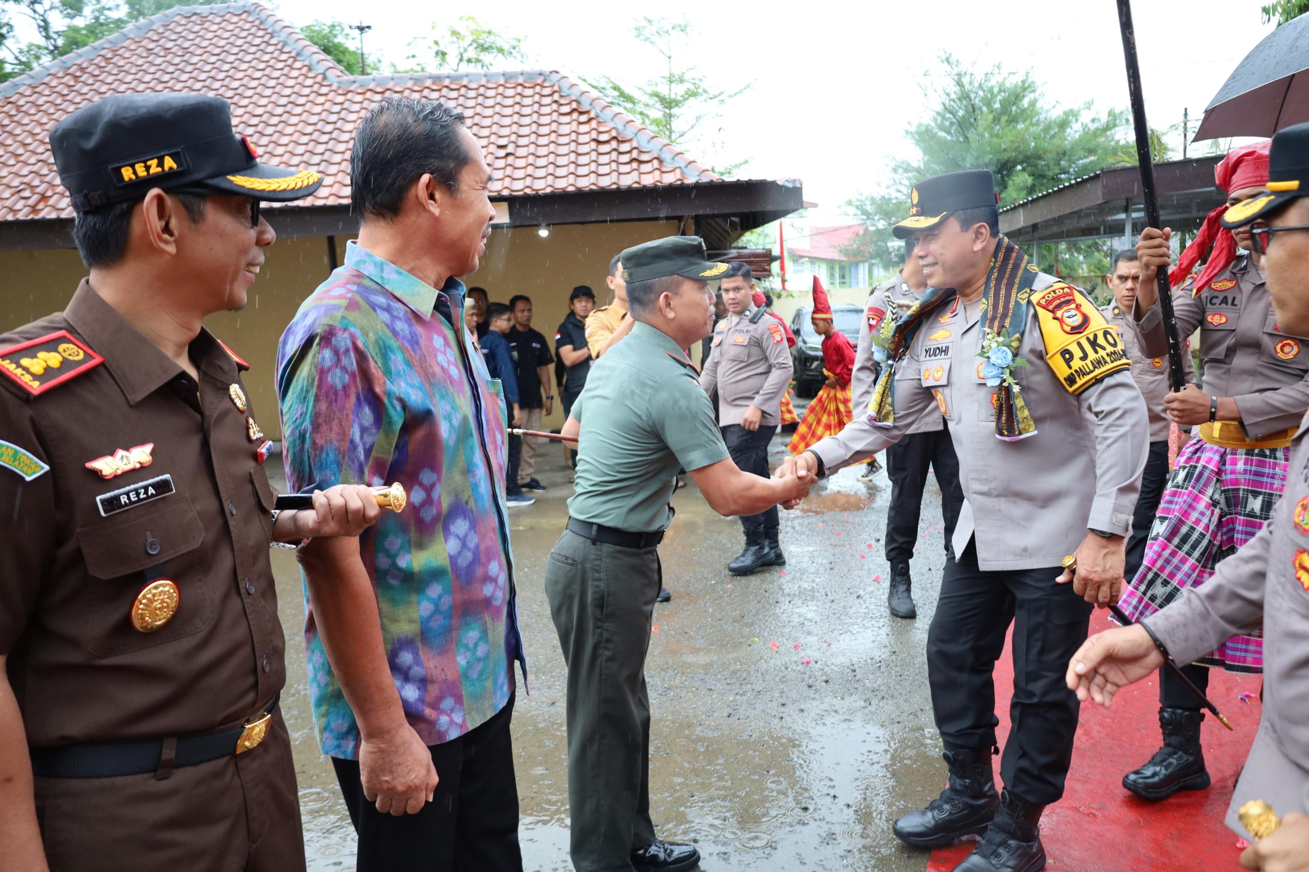 Kedatangan Kapolda Sulsel disambut dengan upacara adat, termasuk prosesi pengalungan Salempang sarung oleh Kapolres Kepulauan Selayar AKBP Adnan Pandibu, S.H., S.I.K. dan dilanjutkan Jajar Kehormatan yang dilakukan oleh personel Polres Kepulauan Selayar.