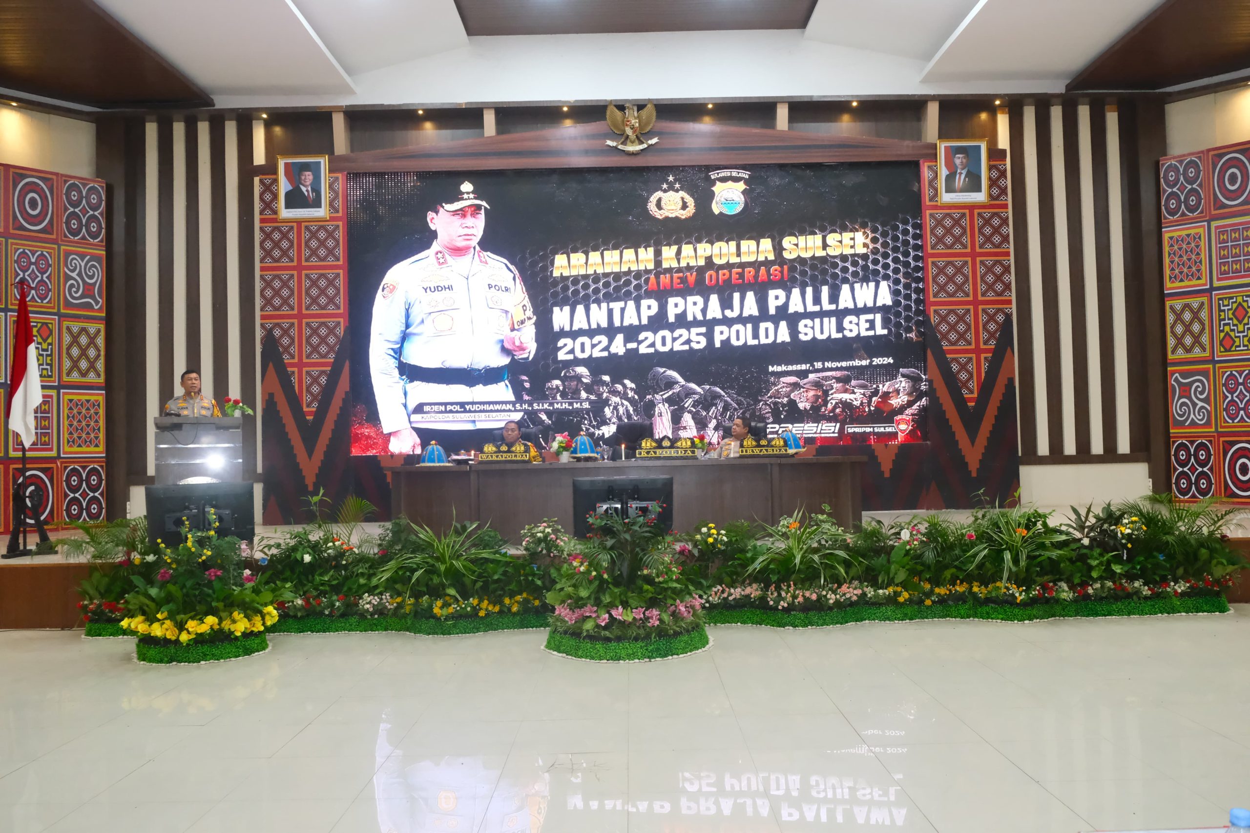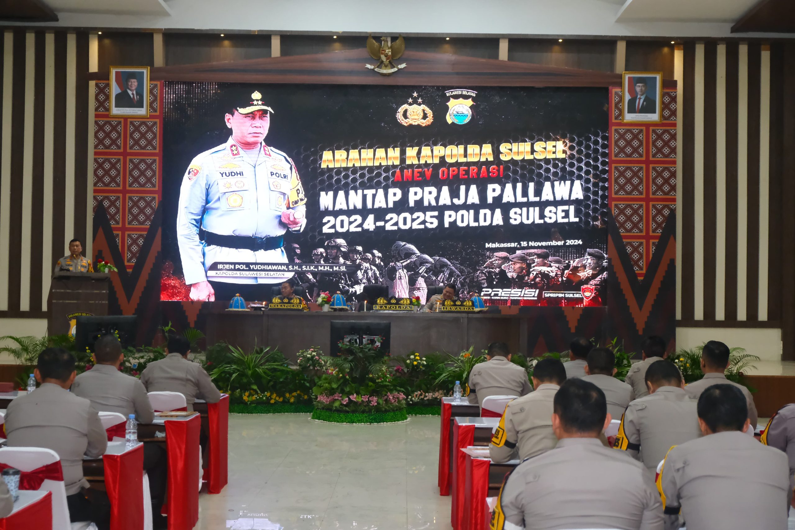 ((Inspirator)-Kapolda Sulawesi Selatan, Irjen Pol. Yudhiawan, S.H., S.I.K., M.H., M.Si., memimpin Rapat Analisis dan Evaluasi (Anev) Operasi Mantap Praja Pallawa 2024-2025 yang bertempat di Aula Mappaoddang, Mapolda Sulsel. Jumat (15/11/24). Acara ini dihadiri oleh Wakapolda Sulsel Brigjen Pol. Nasri, S.I.K., M.H., serta Pejabat Utama Polda Sulsel dan para Kapolres jajaran.