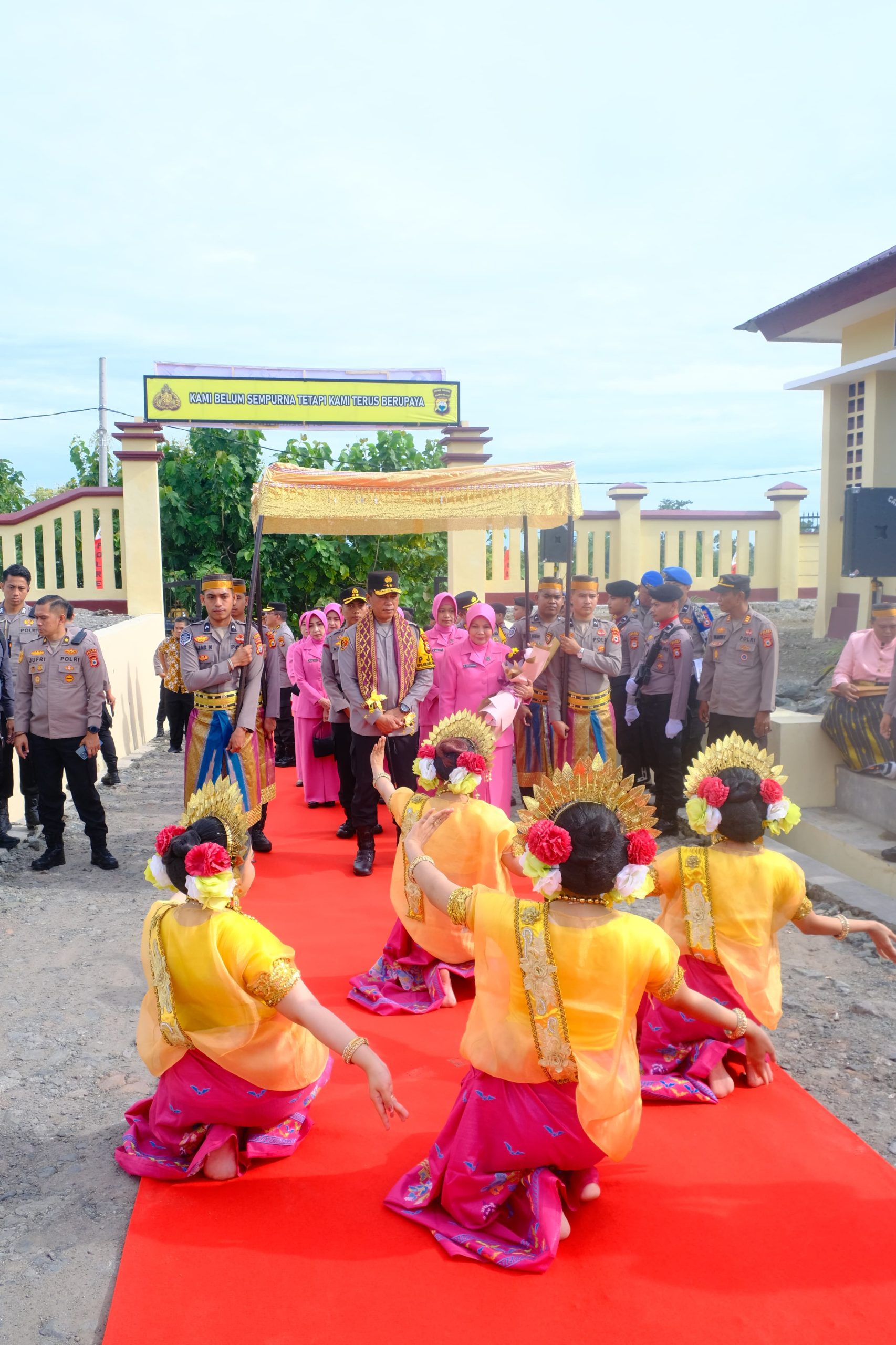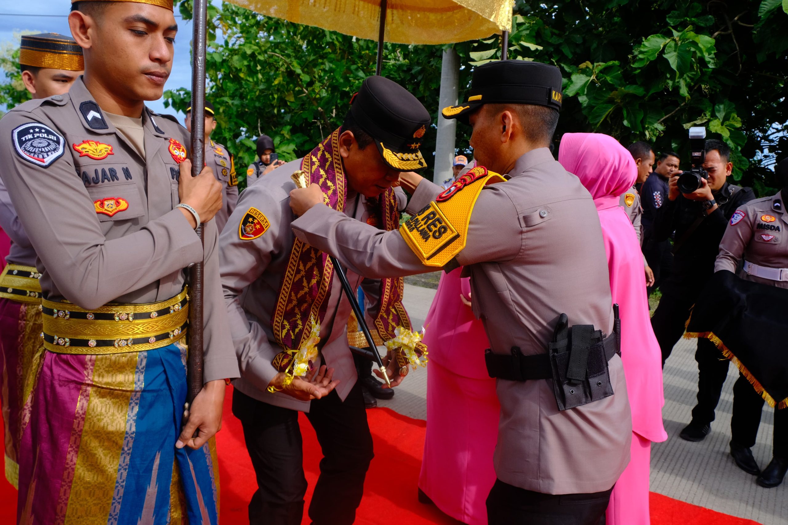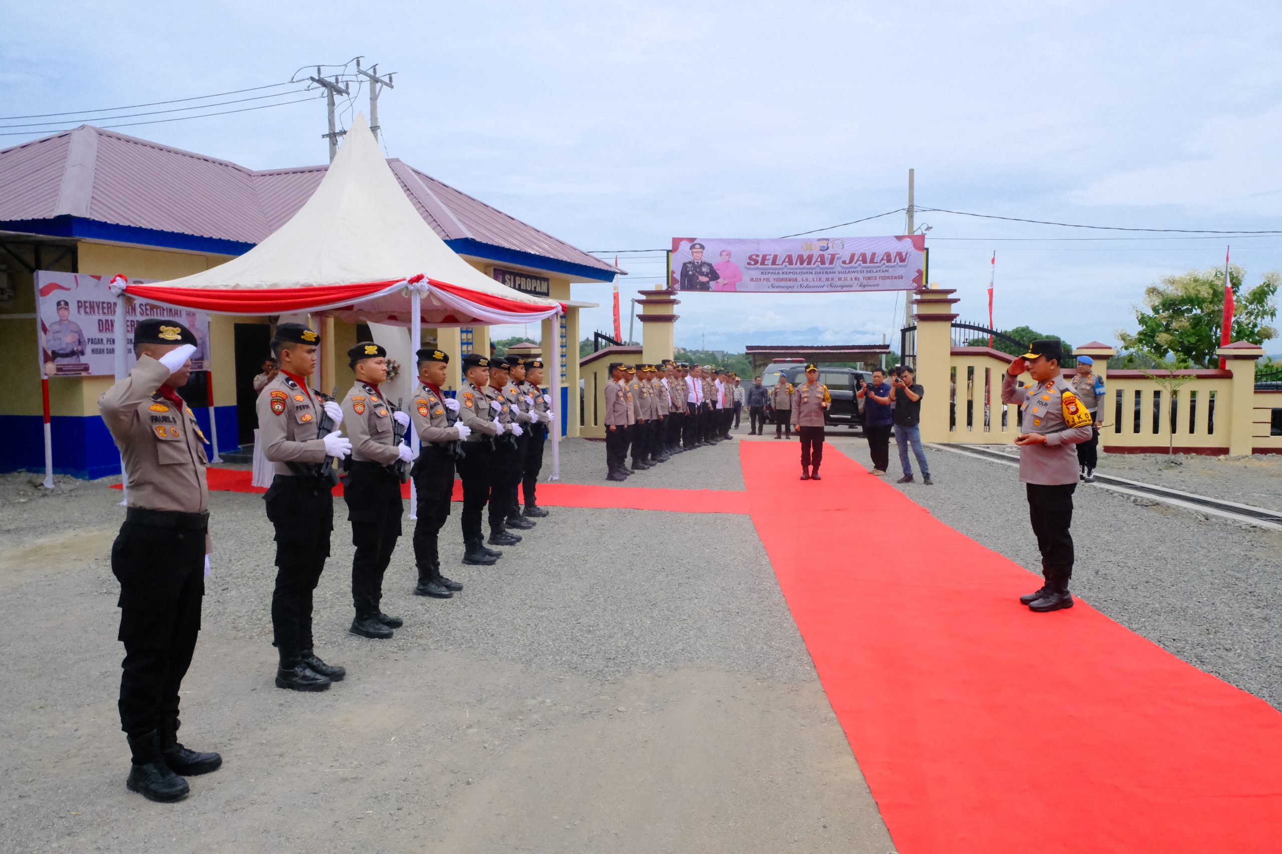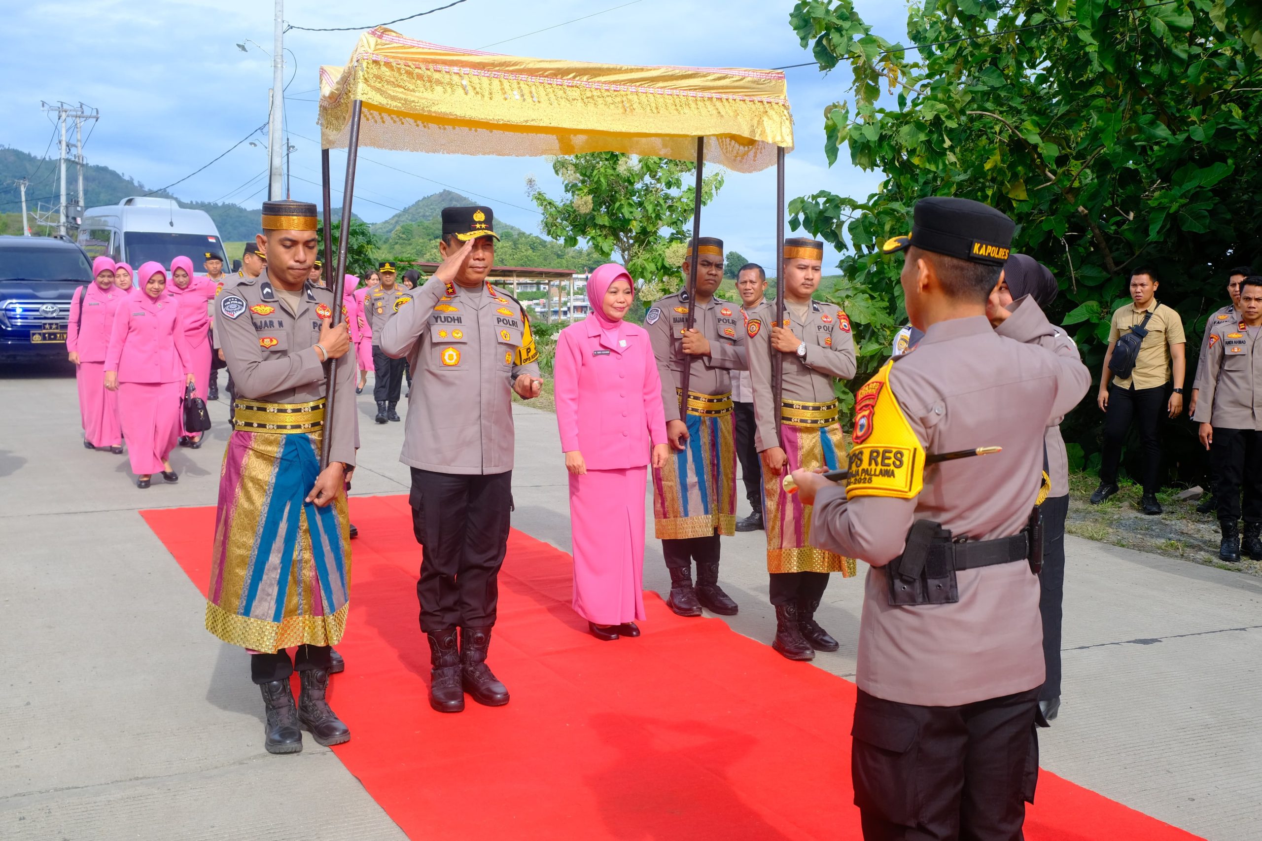 Kedatangan Kapolda Sulsel disambut dengan upacara adat yang meliputi pengalungan Salempang sarung oleh Kapolres Soppeng, AKBP Aditya Pradana, S.I.K., M.I.K., serta pemberian buket bunga kepada Ny. Yunita Yudhiawan oleh Ketua Bhayangkari Cabang Soppeng, Ny. Ageng Aditya dan dilanjutkan Jajar Kehormatan oleh personel Polres Soppeng.