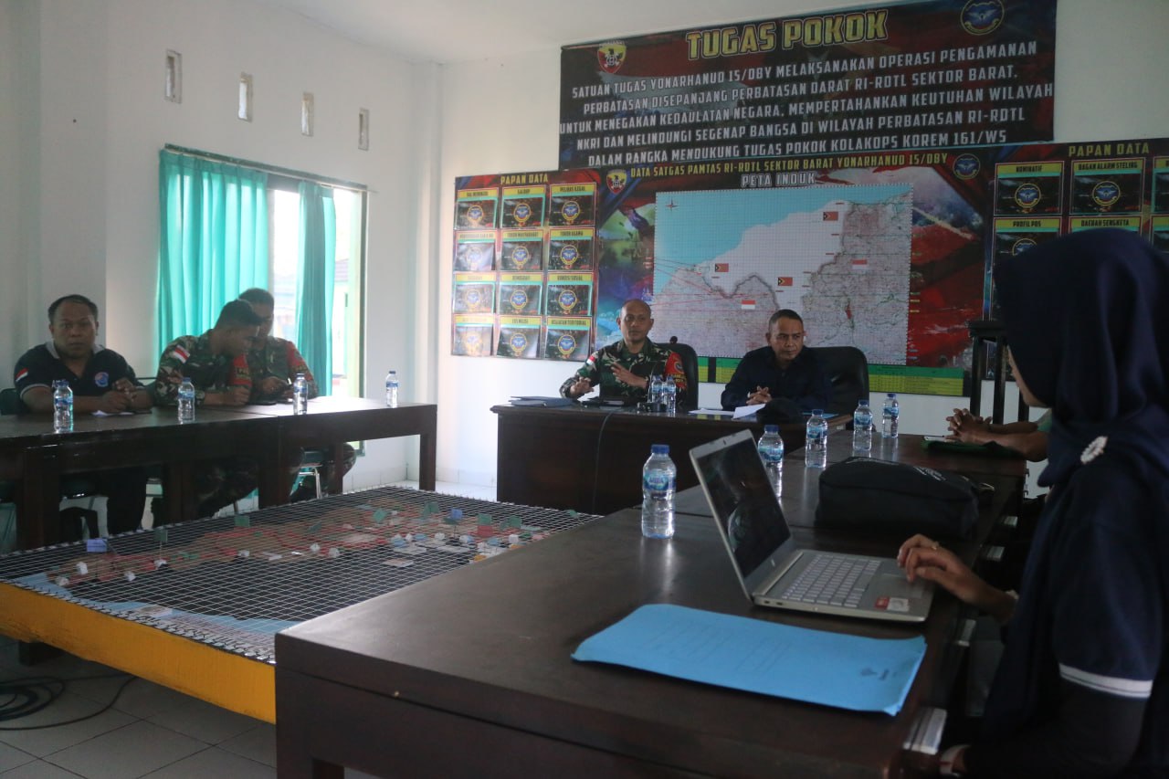 Komandan Satgas Pamtas RI-RDTL Sektor Barat, Letkol Arh Reindi Trisetyo Nugroho, bersama jajaran Perwira Staf, memimpin penyambutan para tamu di Aula Mako Satgas. Letkol Arh Reindi menyampaikan pentingnya kerja sama antara Satgas Pamtas dan BNPP dalam memastikan kondisi pilar dan sarana prasarana perbatasan yang baik sebagai simbol kedaulatan negara dan penunjang aktivitas warga perbatasan.
