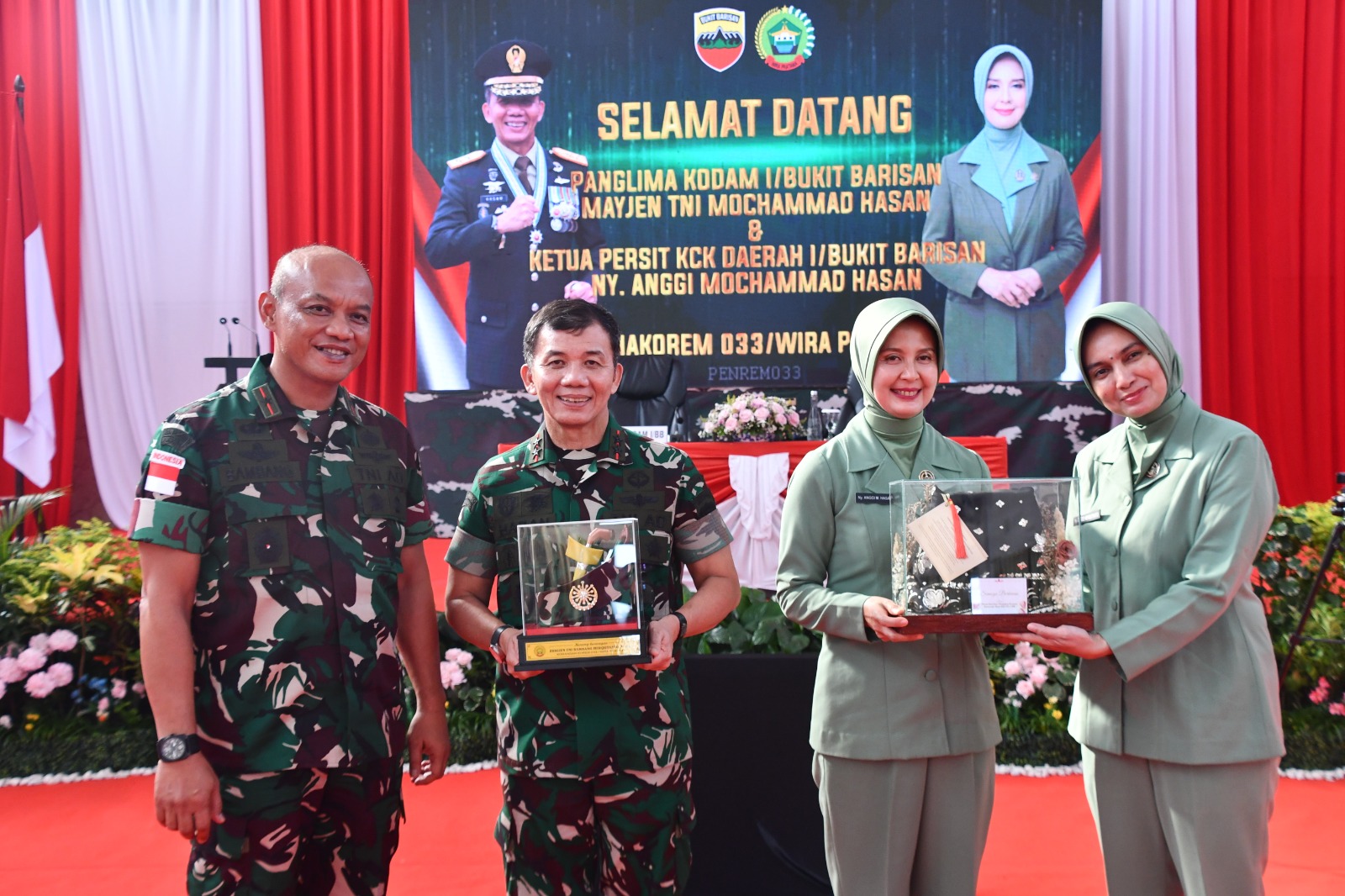 Kedatangan Pangdam bersama Ny Anggi Mochammad Hasan di Makorem 033/Wira Pratama diterima langsung Danrem, Brigjen TNI Bambang Herqutanto didampingi Perwira Staf dan seluruh Prajurit maupun Ketua Persit KCK Koorcabrem 033 PD I/BB serta pengurus jajaran.