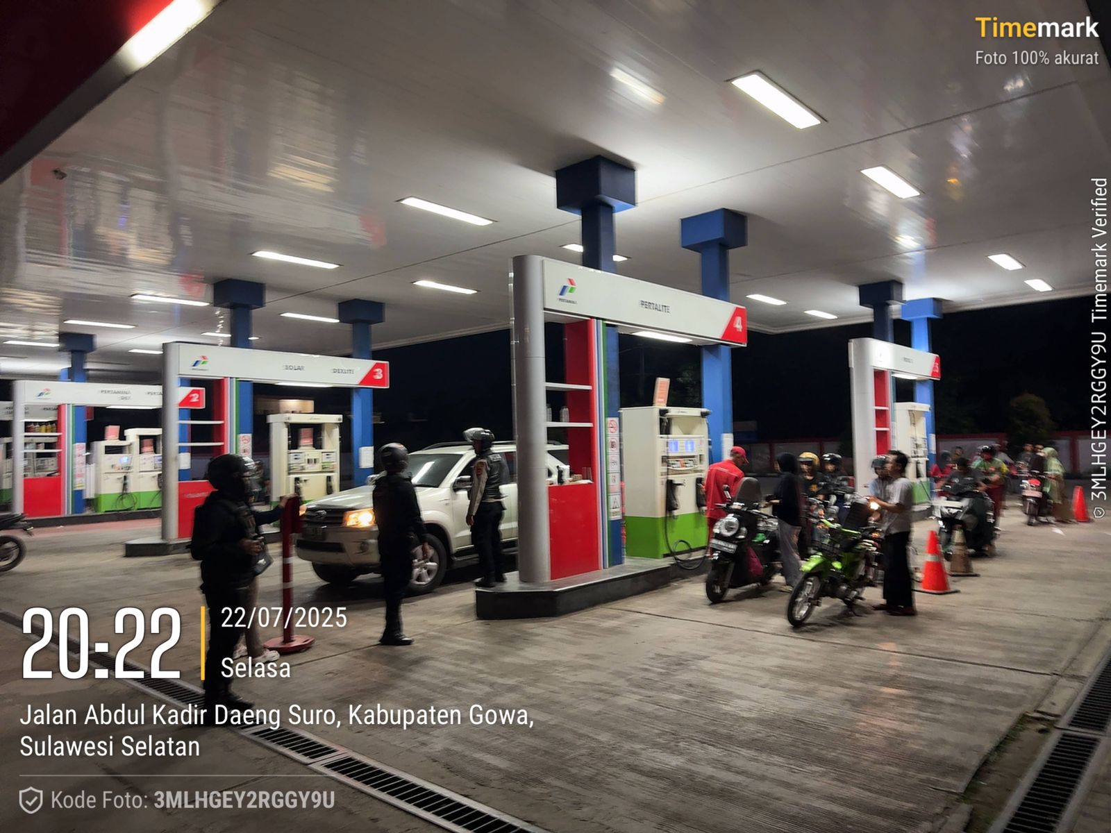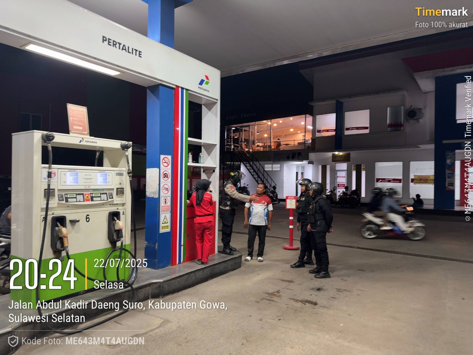 (Inspirator)-Guna menjaga stabilitas keamanan dan ketertiban masyarakat (kamtibmas), Patroli Unit Turjawalj Perintis Presisi Samapta Polres Gowa melaksanakan patroli di sejumlah Stasiun Pengisian Bahan Bakar Umum (SPBU) yang berada di wilayah Kecamatan Somba Opu, Kabupaten Gowa, Selasa (22/7/2025) malam.