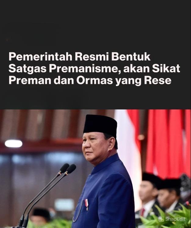 Jakarta, Inspirator-Rakyat-Pemerintah Indonesia membentuk Satuan Tugas Terpadu Operasi Penanganan Premanisme dan Organisasi Kemasyarakatan (Ormas) guna menjaga stabilitas nasional serta melindungi iklim investasi.