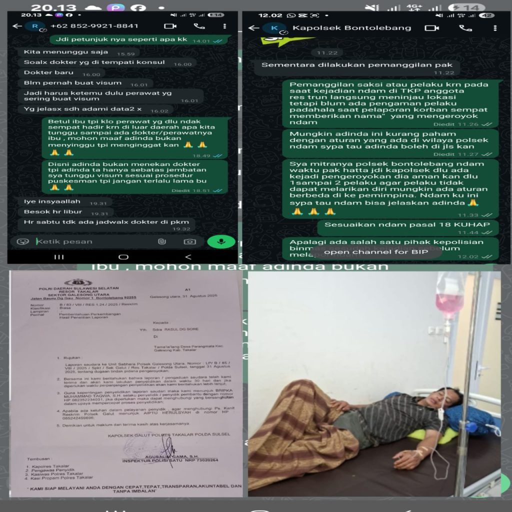 Peristiwa ini menimpa Rasul Dg Sore (48), warga Tamala’lang, Desa Parangmata, Kecamatan Galesong, yang mengaku menjadi korban pengeroyokan pada Minggu (31/8/2025) sekitar pukul 23.00 WITA di Desa Bontomajannang, Kelurahan Bontolebang, Takalar. Rasul melaporkan kasus tersebut dengan nomor Lp/B/85/VIII/2025/SPKT/Sek Galut/Res Takalar/Polda Sulsel.