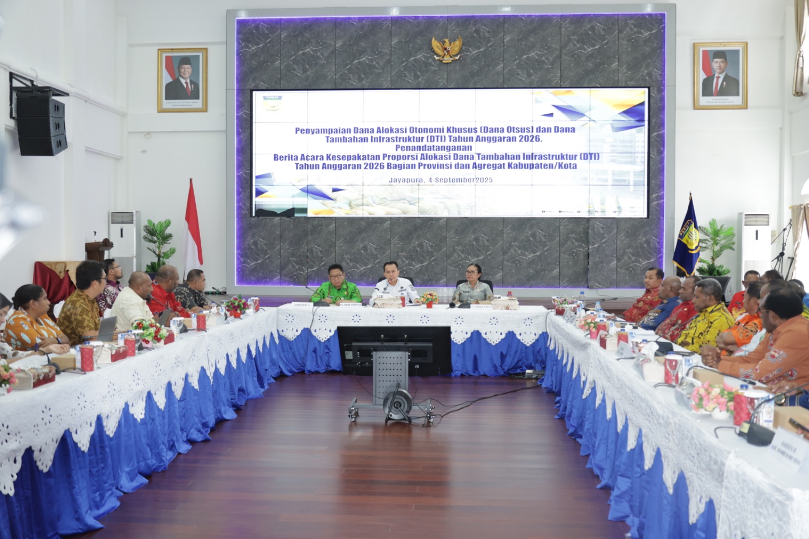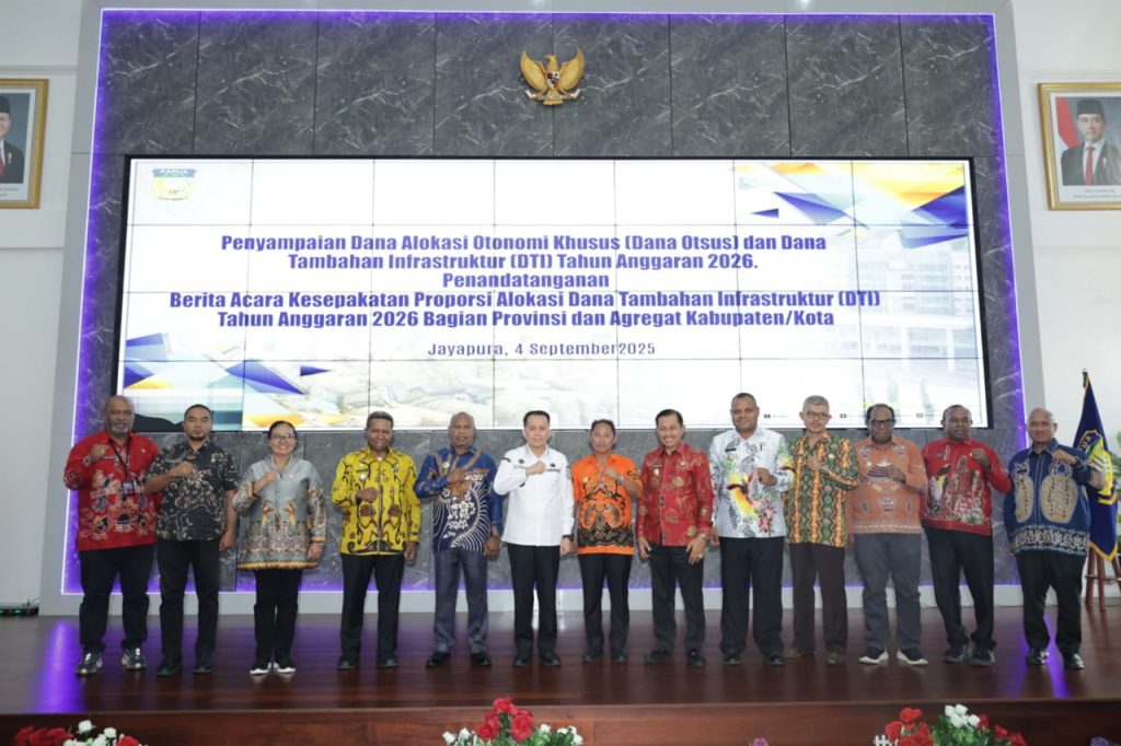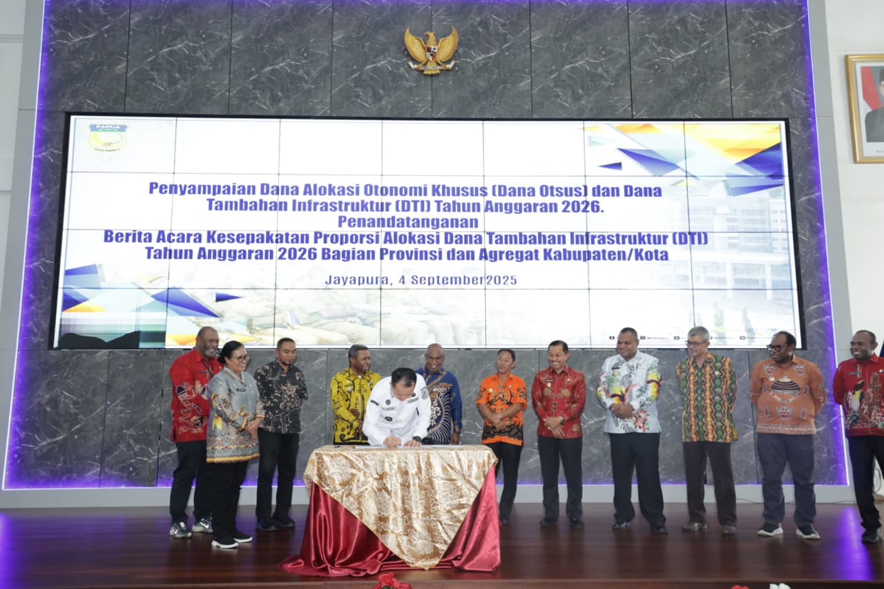 Jayapura, Inspirator-rakyat– Pemerintah Provinsi (Pemprov) Papua bersama Bupati dan Wali Kota se-Papua resmi menandatangani nota kesepakatan proporsi alokasi Dana Otonomi Khusus (Otsus dan Dana Tambahan Infrastruktur (DTI) Tahun Anggaran 2026. Kegiatan ini berlangsung di Lukmen Hall, Gedung Negara, Jayapura, Papua, Kamis (04/09/2025).