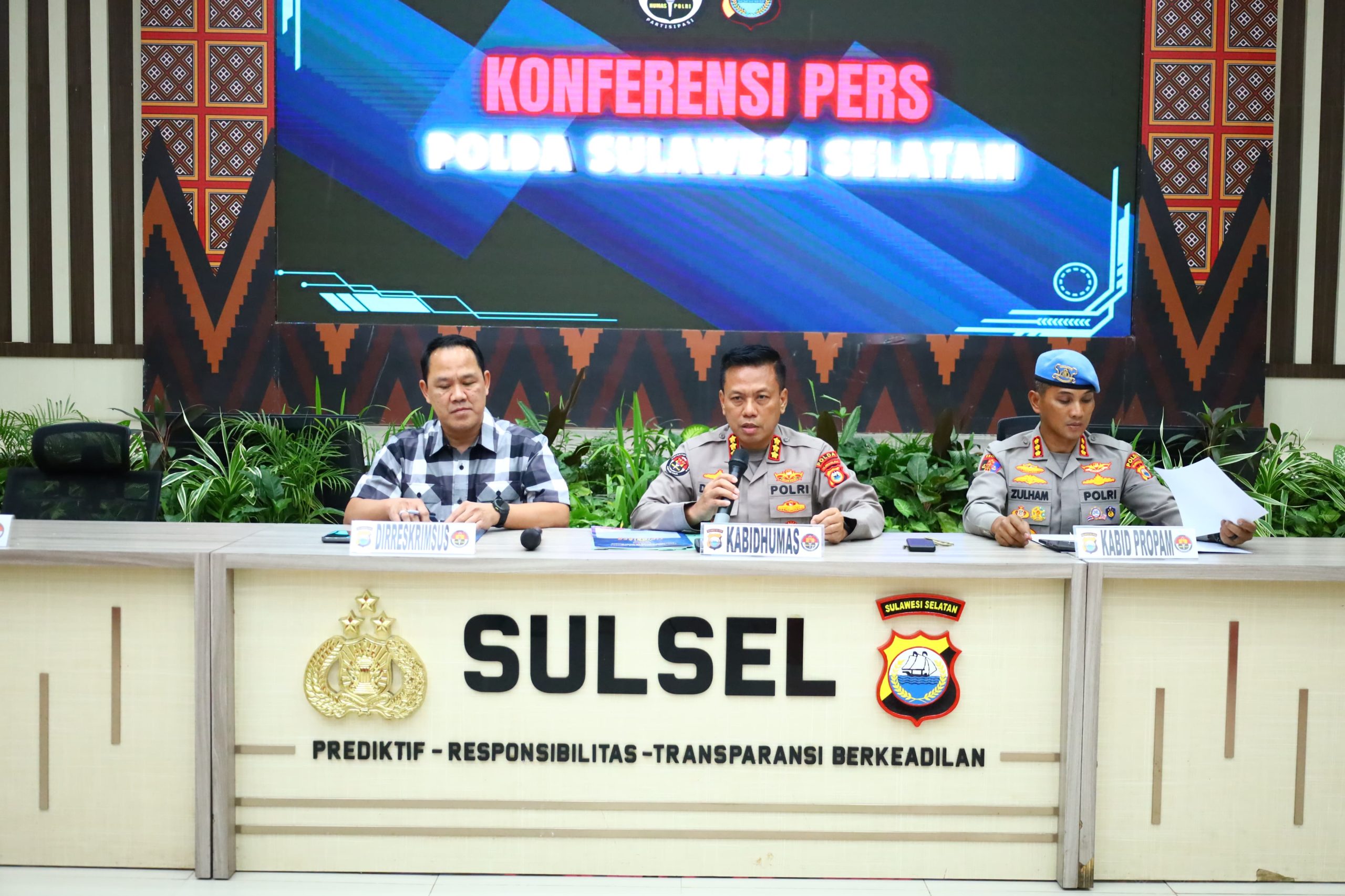 (Inspirator)-Direktorat Reserse Kriminal Khusus (Ditreskrimsus) Polda Sulawesi Selatan menggelar konferensi pers terkait perkembangan penanganan kasus penipuan online, Sabtu (26/4/2025), di Aula Mappaoddang, Mapolda Sulsel. Konferensi pers ini dipimpin oleh Dirkrimsus Polda Sulsel Kombes Pol Dedi Supriyadi, S.I.K., didampingi Kabid Humas Kombes Pol Didik Supranoto, S.I.K., M.H., dan Kabidpropam Kombes Pol Zulham Effendi, S.I.K., M.H.