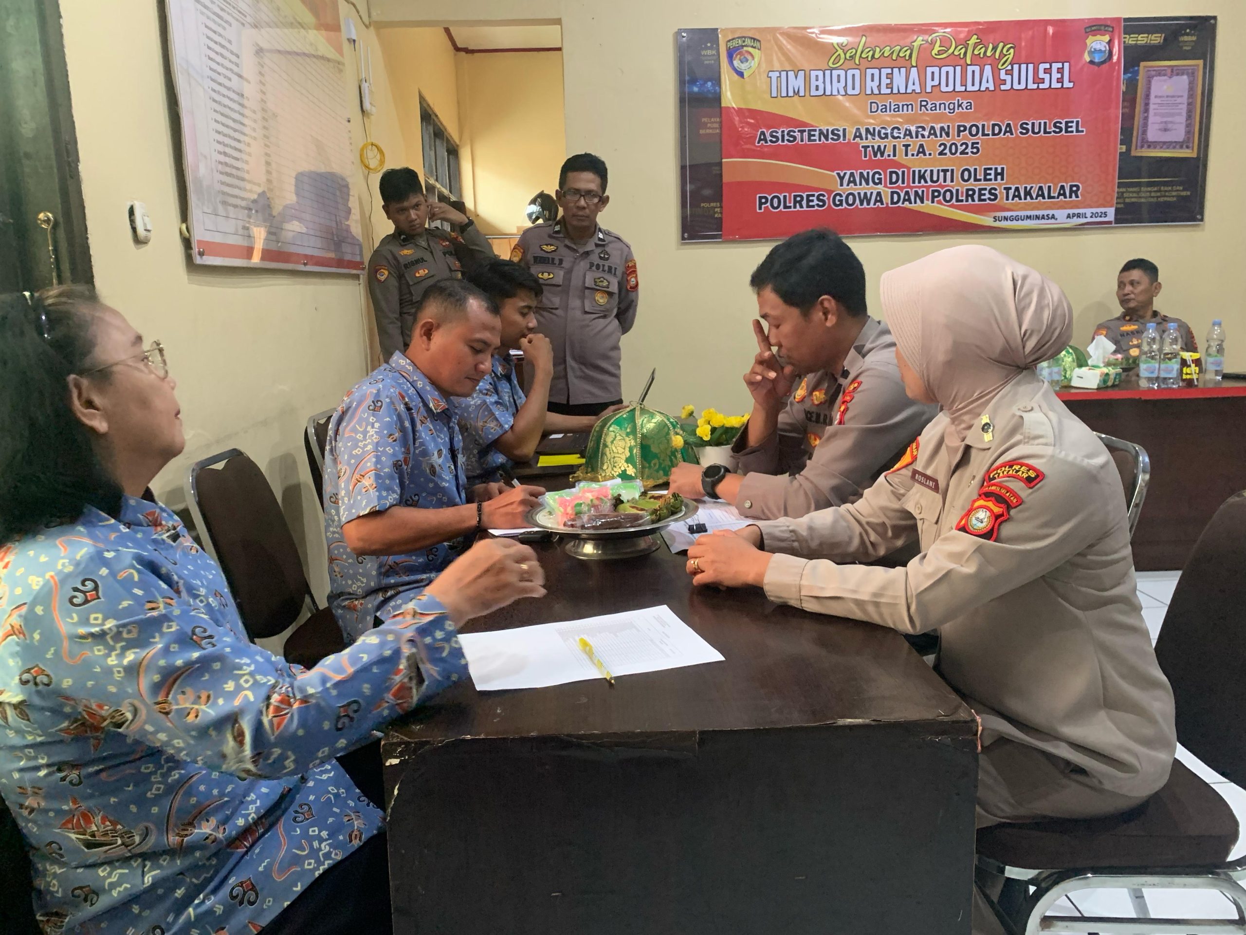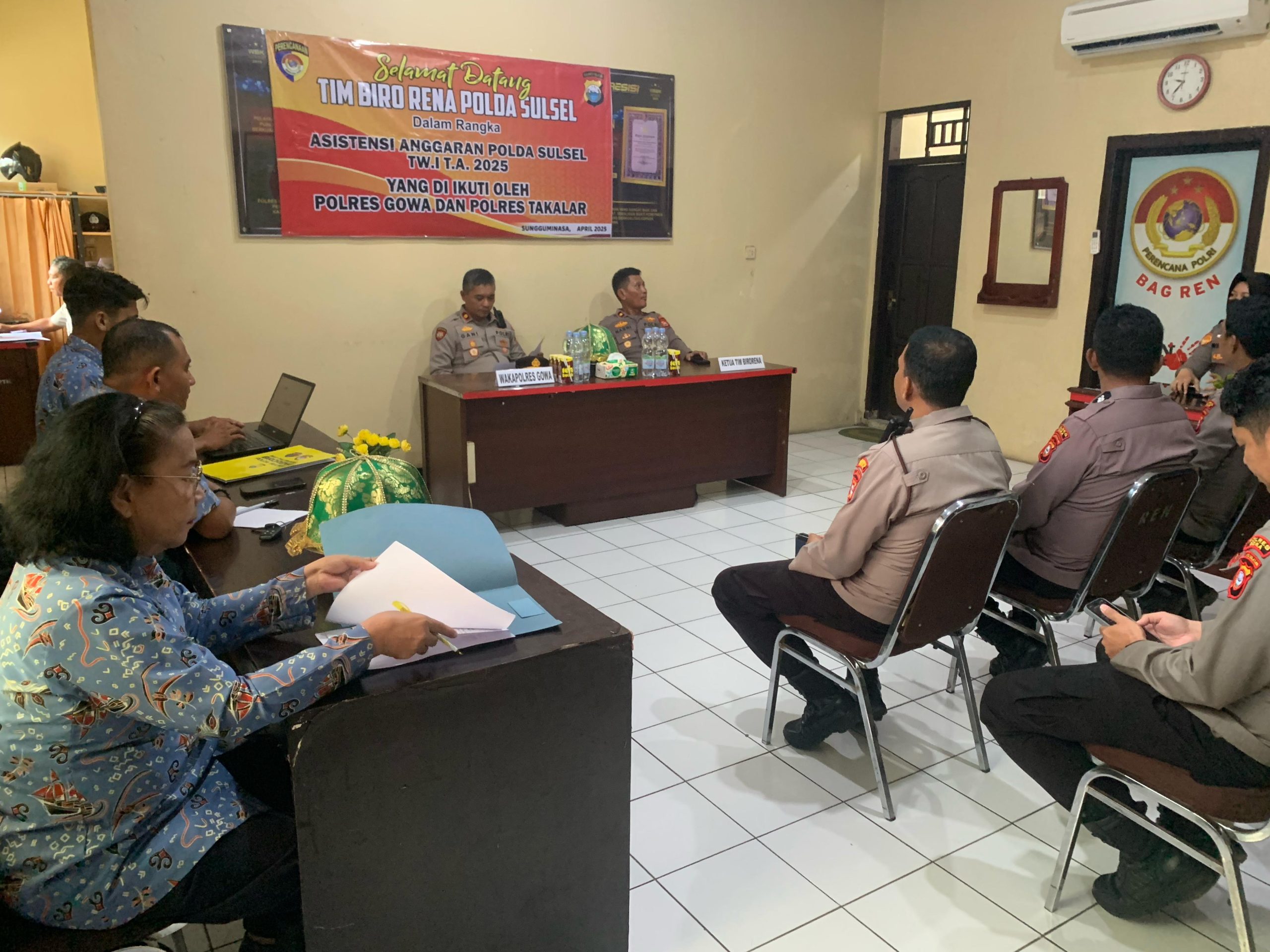 (Inspirator)-Polres Gowa menyambut kedatangan Tim Biro Rena Polda Sulsel dalam rangka kegiatan asistensi penyerapan anggaran Triwulan I (TW I) tahun anggaran 2025. Kegiatan berlangsung pada Rabu (16/4/2025), bertempat di ruang rapat Bagren Polres Gowa.