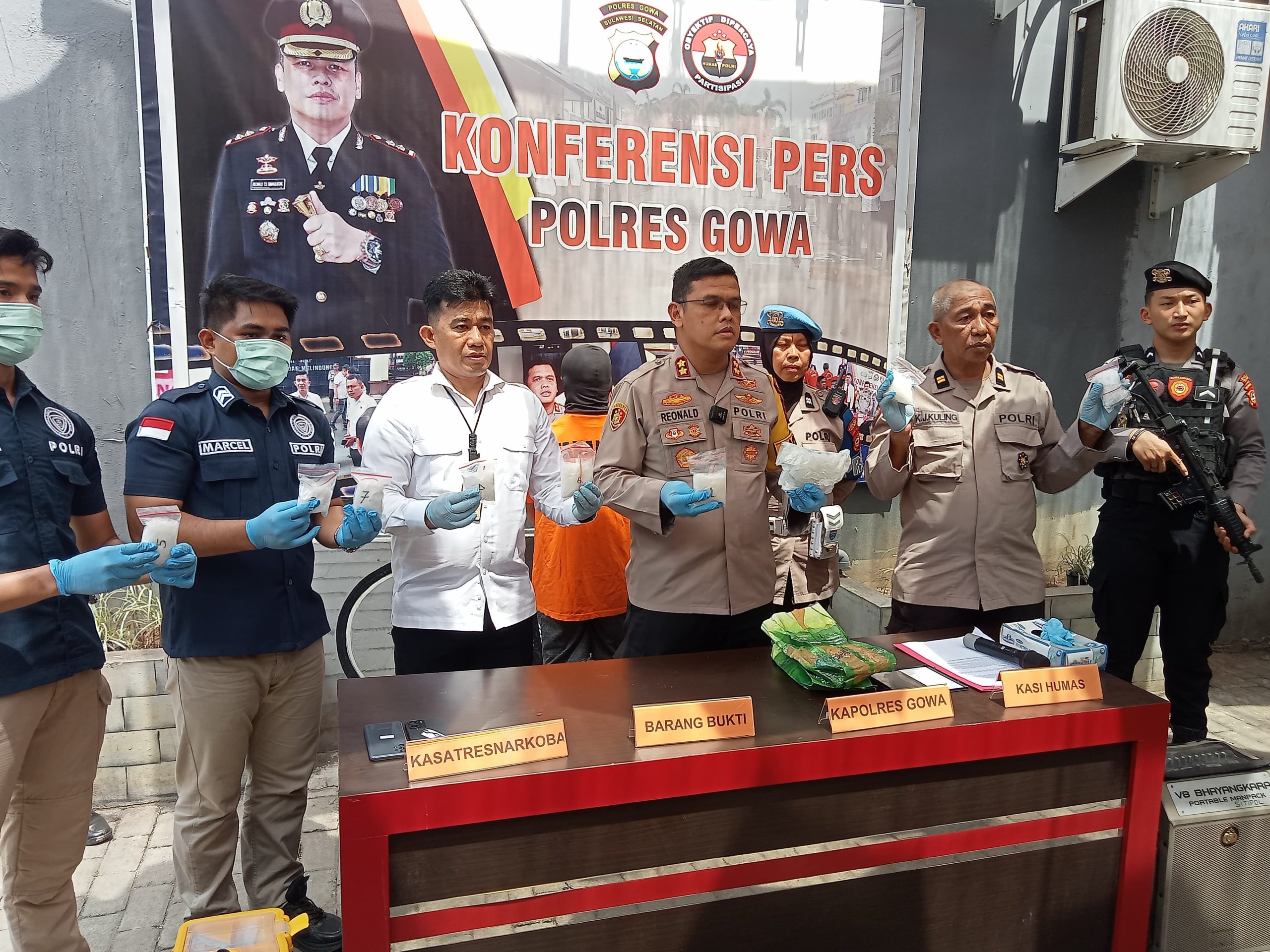 (Inspirator)-Polres Gowa kembali menggelar konferensi pers terkait pengungkapan tindak pidana penyalahgunaan dan peredaran narkotika jenis sabu di wilayah Kabupaten Gowa.