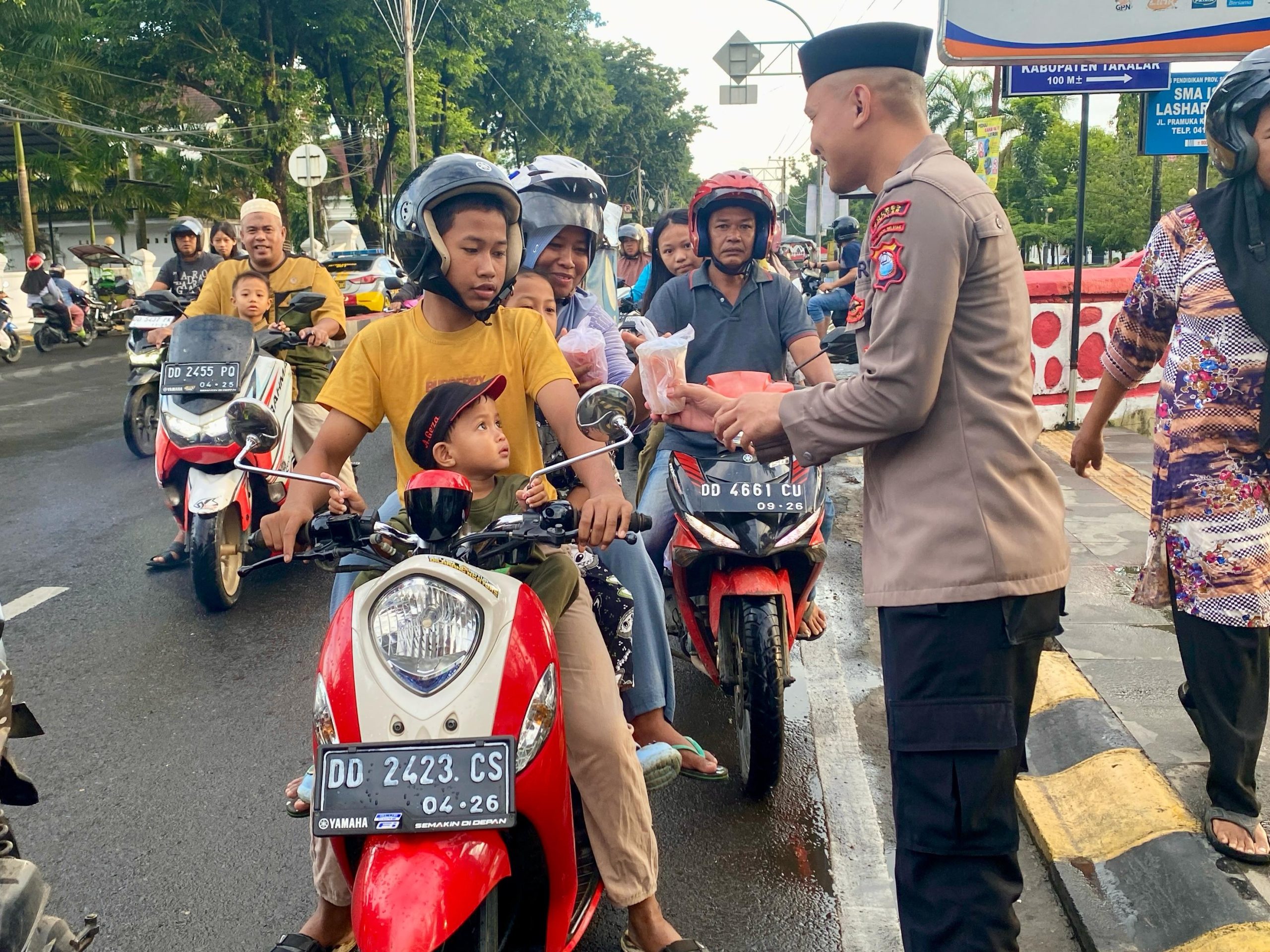 Kegiatan ini berlangsung pada Minggu (16/3) sekitar pukul 17.00 Wita di Jalan Poros Jenderal Sudirman, tepat di depan Pos Kamseltibcar Lantas Polres Takalar.