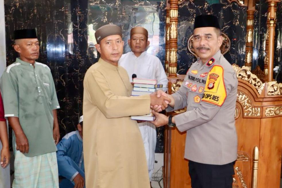 Tak hanya membawa pesan keamanan, kegiatan ini juga diwarnai dengan semangat berbagi. Sebagai bentuk kepedulian terhadap kegiatan keagamaan, Wakapolres menyerahkan bantuan 10 mushaf Al-Qur’an kepada panitia Masjid Nurul Huda.