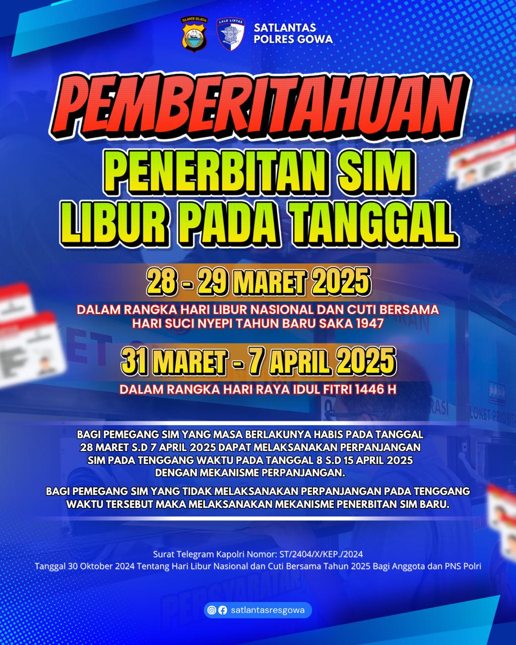 (Inspirator)-Satuan Lalu Lintas (Satlantas) Polres Gowa, pada Selasa (25/3/2025), mengumumkan bahwa pelayanan penerbitan Surat Izin Mengemudi (SIM) akan libur pada: