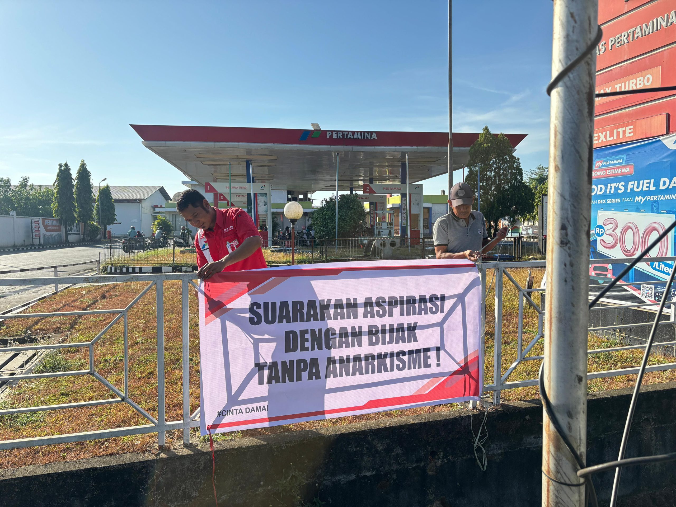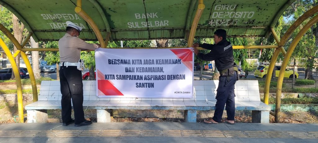 Melalui spanduk tersebut, masyarakat diajak untuk tetap menjaga ketertiban dan kondusifitas, khususnya dalam penyampaian aspirasi agar senantiasa berlangsung aman, damai, serta menghormati kepentingan bersama.