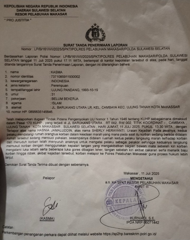 Selanjutnya, korban yang bernama Kasma tidak terima dengan apa yang di lakukan para pelaku terhadap dirinya, kini korban melaporkan kejadian yang menimpa dirinya di sektor kepolisian polres pelabuhan dengan bukti surat tanda penerimaan laporan, Berdasarkan laporan polisi Nomor : LP/B/161/VII/2025/POLRES PELABUHAN MAKASSAR/POLDA SULAWESI SELATAN.
