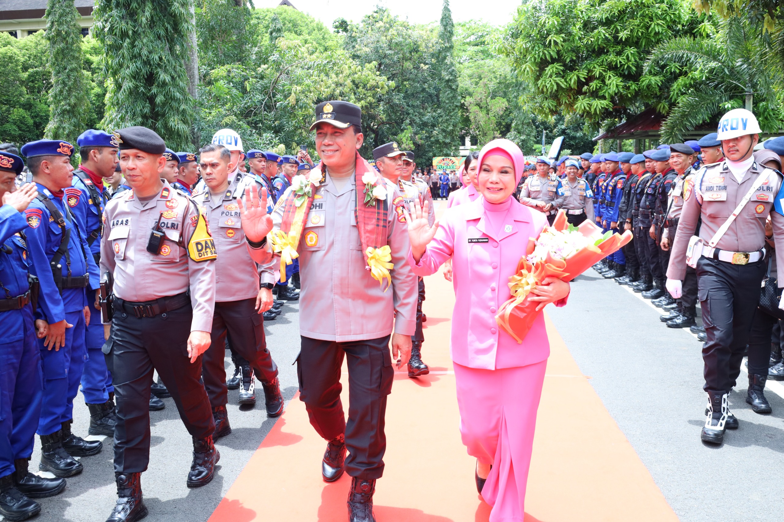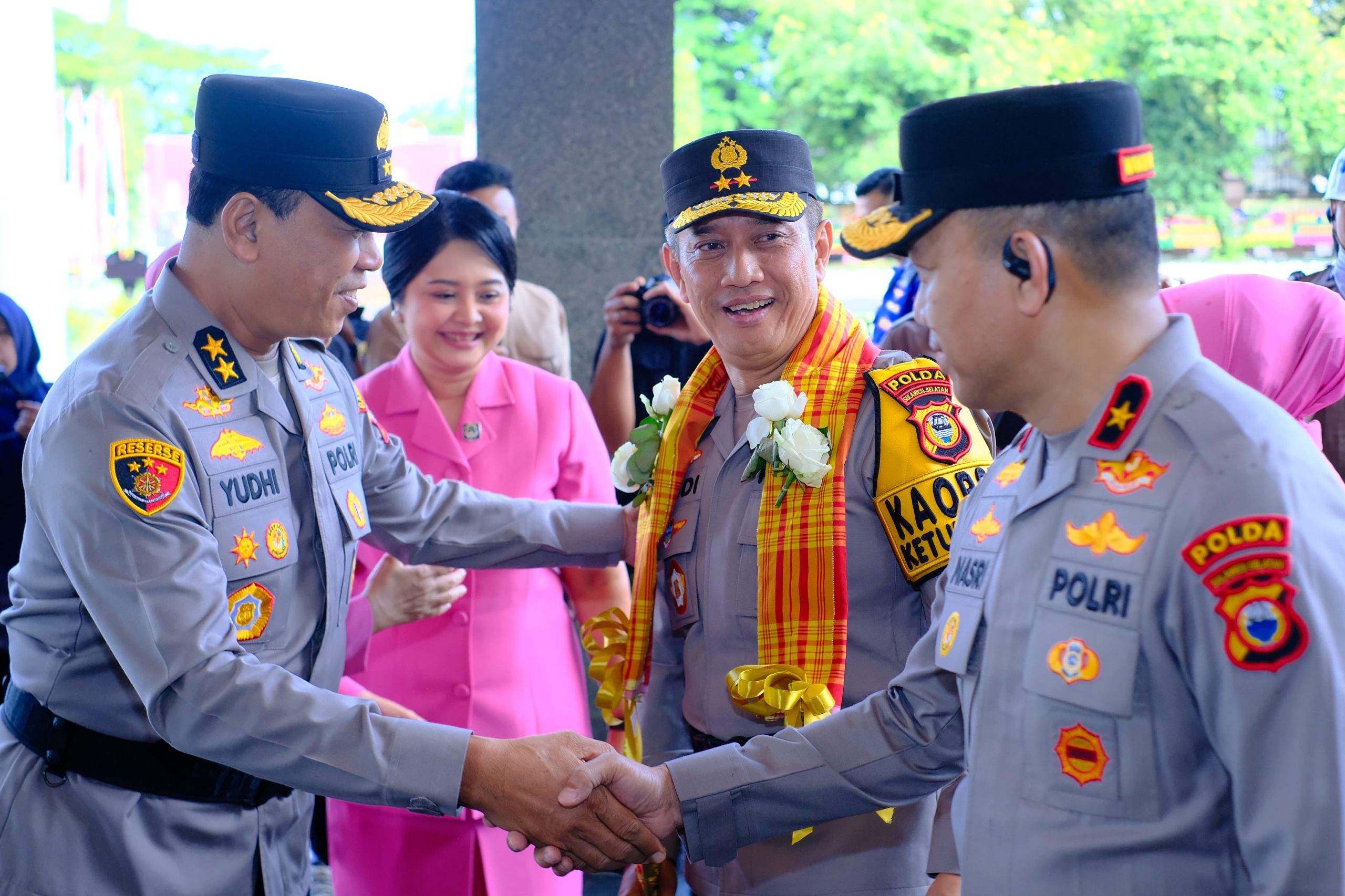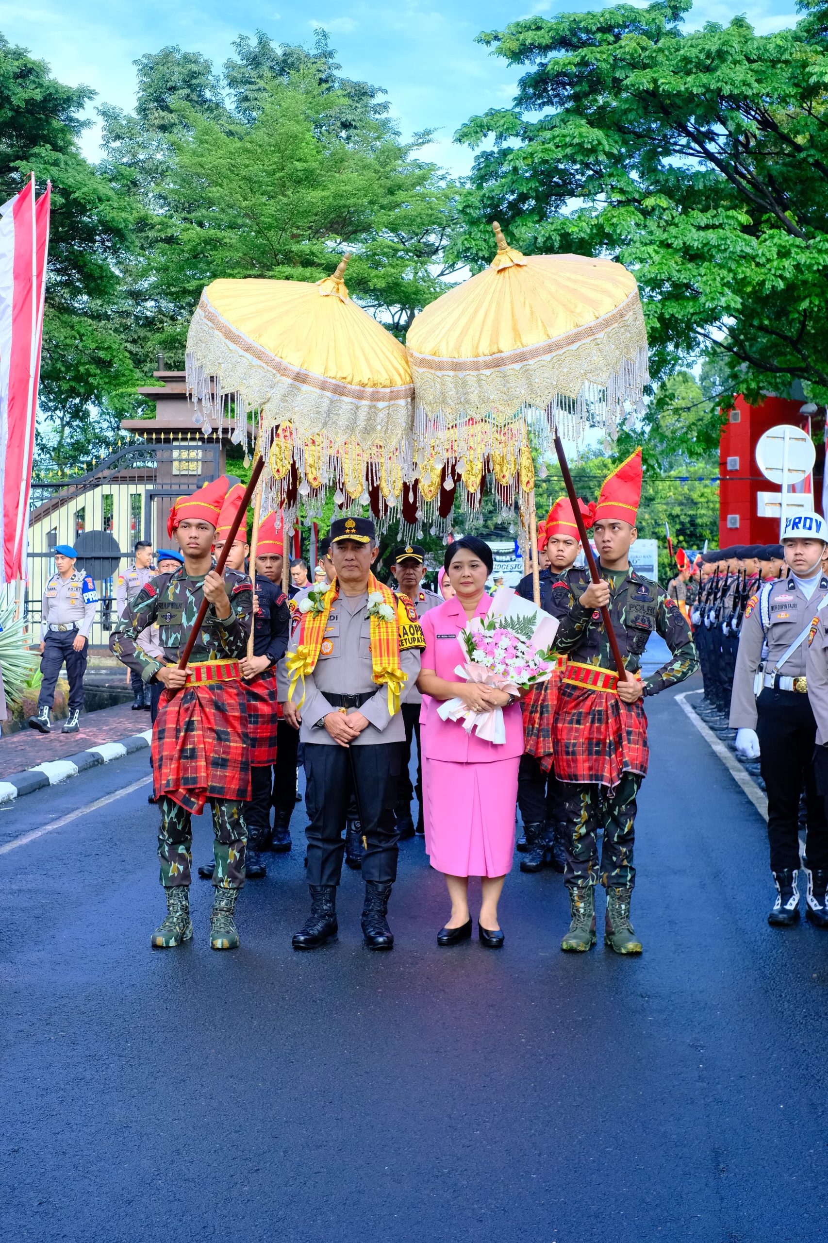 Kapolda Sulsel Irjen Pol. Drs Rusdi Hartono, M.Si beserta Istri kemudian menyapa jajaran personil Polda Sulsel yang berdiri berjejer menyambutnya